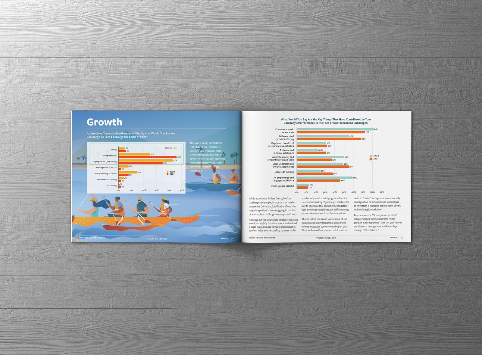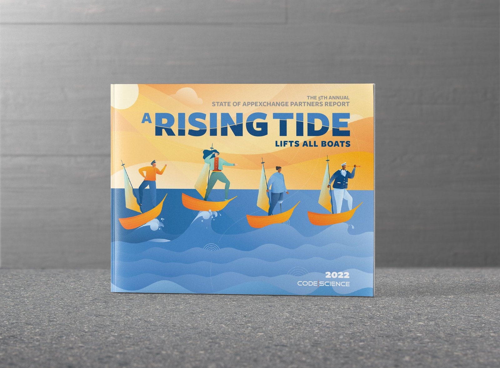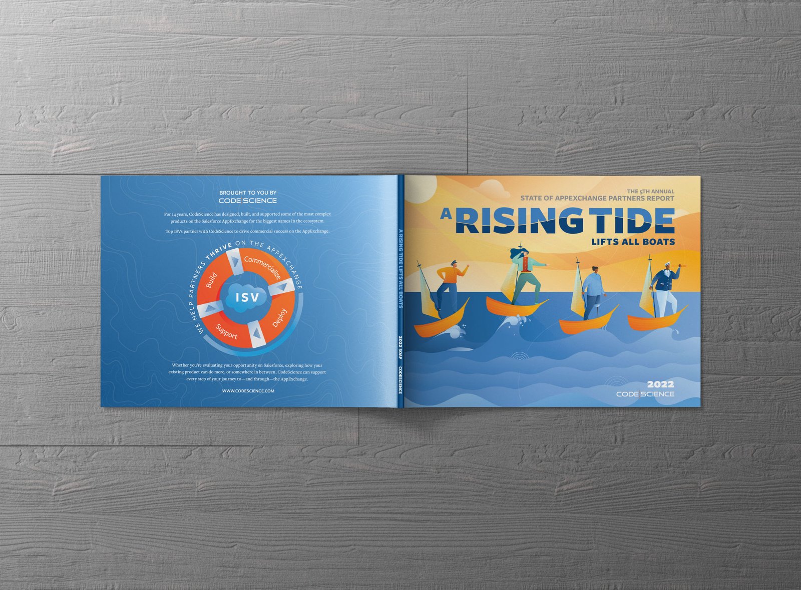 We had the pleasure of teaming up with DK Design Studio, Inc to bring to life the 5th Annual State of AppExchange Partners Report 2022 for CodeScience! It was a truly uplifting and energizing experience. Working alongside DK Design Studio, we were able to create stunning illustrations and graphics that perfectly captured our theme, “A rising tide lifts all boats.”